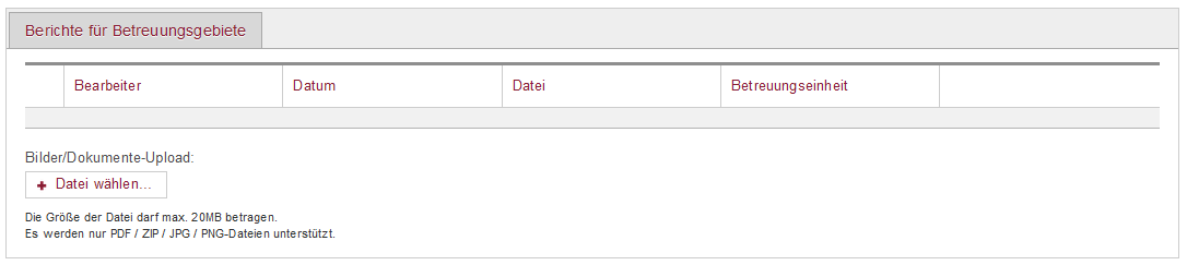 Mit Ausführen der Aktion „Berichte für Betreuungsgebiete hochladen“ können Dokumente und Bilder im Rahmen der Aufgabenumsetzung von den zuständigen VN-Beratern hochgeladen werden. Dieser Bereich dient auch dazu, den zuständigen Landwirtschaftsbehörden entsprechende Informationen, welche das Betreuungsgebiet umfassen, bereitzustellen.